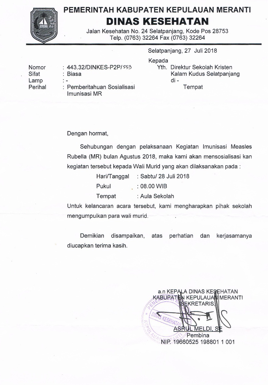 Berdasarkan Surat Edaran Dinas Kesehatan dengan nomor 443.32/DINKES-P2P/553 perihal Imunisasi MR (Measles Rubella) yang