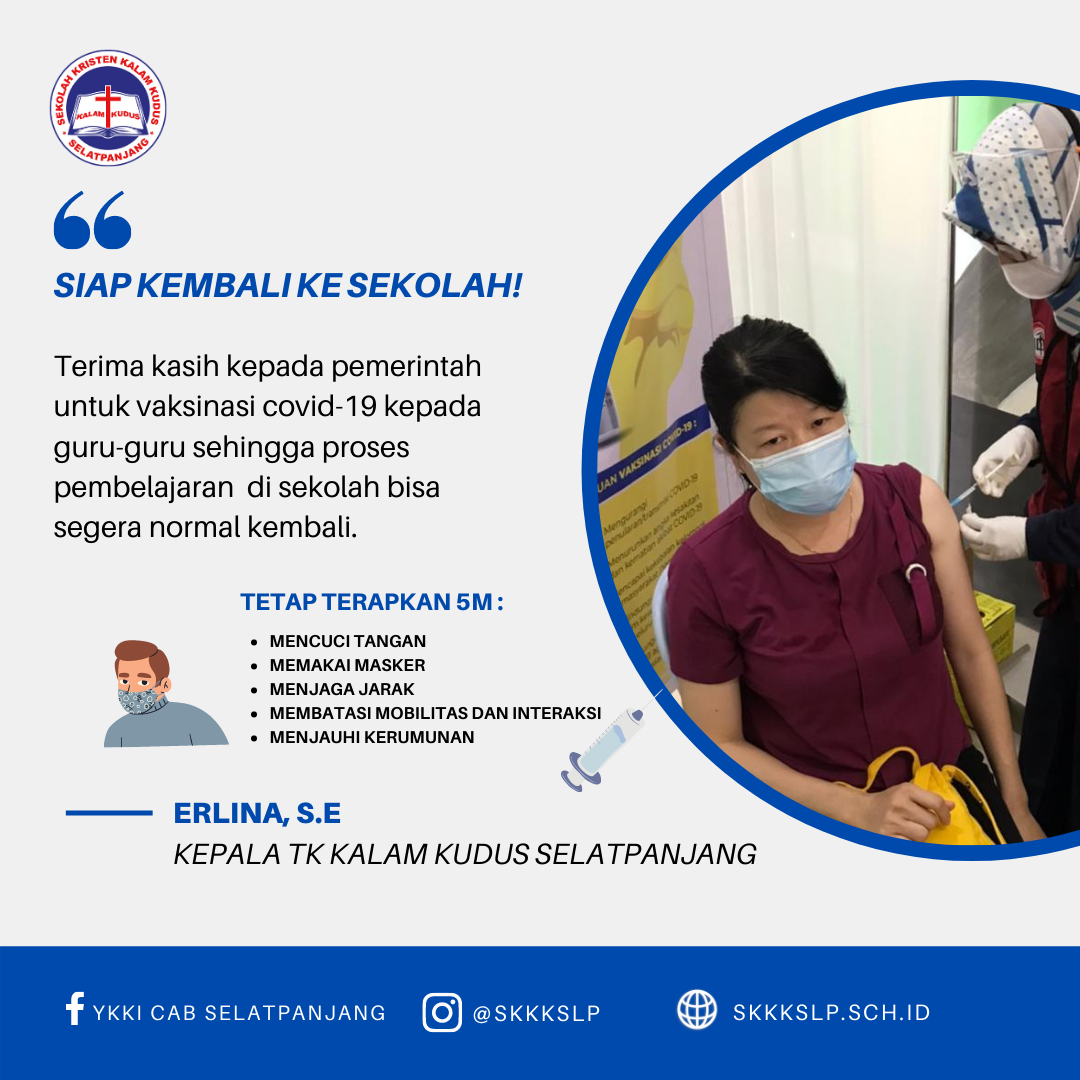 Puji syukur guru-guru TK, SD, dan SMP Kalam Kudus Selatpanjang telah diberikan vaksin Covid-19 tahap 1 oleh pemerintah sehingga proses pembelajaran peserta didik di sekolah bisa segera normal kembali. Terima kasih kepada pemerintah atas perhatiannya terhadap dunia pendidikan.